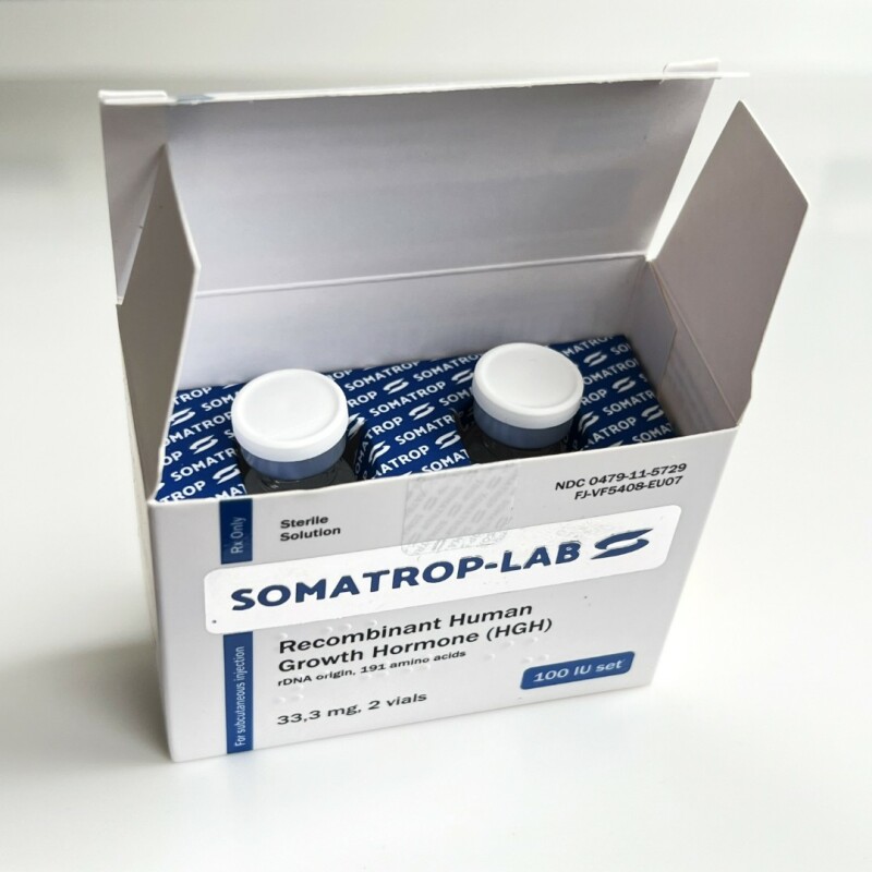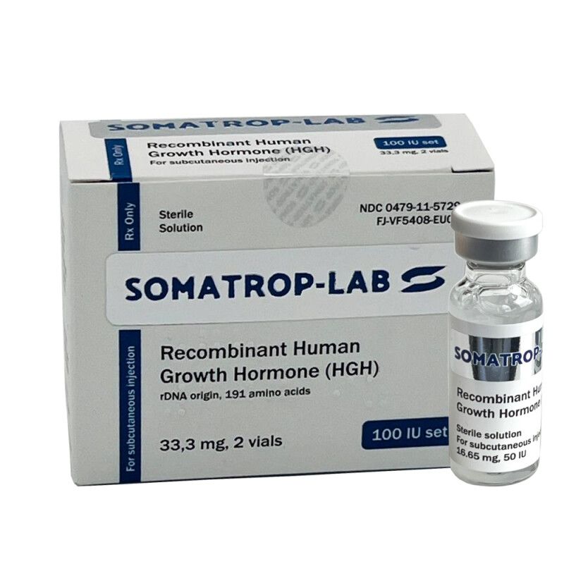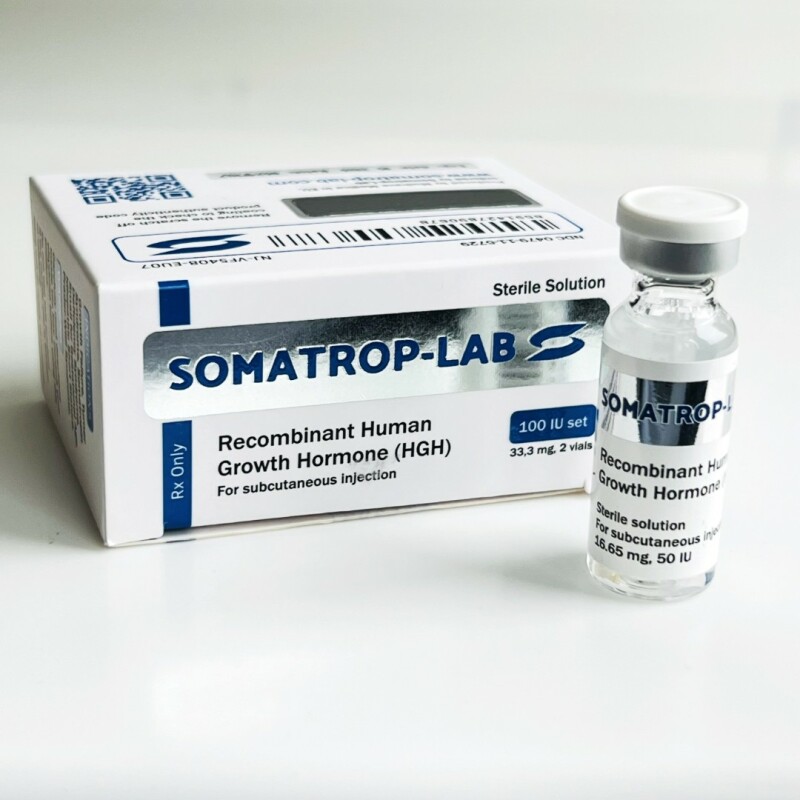 Гормон Соматроп-Лаб (Соматотропін) 100 IU/од Гормон Росту Соматроп-Лаб вважається високоякісним препаратом який володіє високим ступенем результативності. Виробляється заводом в Чехії на сучасному оборудывании. В упаковці 2 флакона, (по 5мл), На 1 ампулу 50ЕД дозування. Відповідно в пачці на 2 ампули доводиться 100ЕД. Щоб постійно прогресувати в професійному плані, кожному досвідченому і починаючому спортсмену на певному етапі доводиться приймати анаболічні стероїди. Правильне використання представників ААС та інших спортивних препаратів допоможе будь-якому атлетові стати на порядок сильніше, витривалішими, наростити суху мускулатуру, отримати промальований рельєф. Гормон росту Somatrop-lab 100 IU/од. (Чехія) багато років успішно застосовується в спортивному світі для формування презентабельною, позбавленої рідини і жиру, твердою і щільною мускулатури. Що собою являє Гормон росту Гормон росту має і інші відомі назви: Соматотропін; Соматотропний гормон; Соматотропін; ГР; СТГ; HGH. Гормон росту Somatrop-lab являє собою пептидний гормон. Його вироблення відбувається в передній частці гіпофіза. Цей важливий людський гормон не тільки позитивно впливає на виробництво білка, регуляцію обміну вуглеводів, а також бере активну участь у роботі багатьох органів і систем. Якщо у людини спостерігається м'язова слабкість у дорослому віці, порушений ріст волосся, є остеопороз, є затримка росту в дитячому віці і так далі, йому потрібно здати аналіз на кількість соматотропіну в організмі. Вироблення власного Гормону росту Гормон росту називають гормоном молодості. Краще всього він виробляється під час повноцінного нічного сну і виконання фізичних вправ. Щоб забезпечити високу концентрацію соматотропного гормону в крові, спортсмену слід виконувати такі рекомендації: Нормально висипатися – в середньому це 8 – 9 годин спокійного нічного сну. Відхід до сну не пізніше 23.00 години. Давати на організм посильні фізичні навантаження. Регулярні силові тренування атлетів у допомогу. Забезпечити надходження в організм будівельного компонента білка допомогою корекції щоденного харчового раціону. Також корисний прийом амінокислот, а саме лізину, глутаміну, аргініну, орнітину. Контролювати рівень цукру в структурі крові. Стежити за гормональним фоном, тобто перевіряти кількість тиреоїдних гормонів, а також естрогенів, соматолиберина і так далі. Не допускати тривалих стресів, що згубно впливають на концентрацію гормону росту в організмі. Курс прийому Гормону росту Somatrop-lab у спорті При виборі дозування для проведення курсу Гормону росту соло спортсмену слід пам'ятати, що вміст даного гормону в 1 ін'єкції в нормі не повинно перевищувати 30 МО. В основному середня робоча дозування для курсу кожного атлета підбирається в індивідуальному порядку: Силовикам і іншим спортсменам можна вводити по 10 – 30 МО препарату на добу...